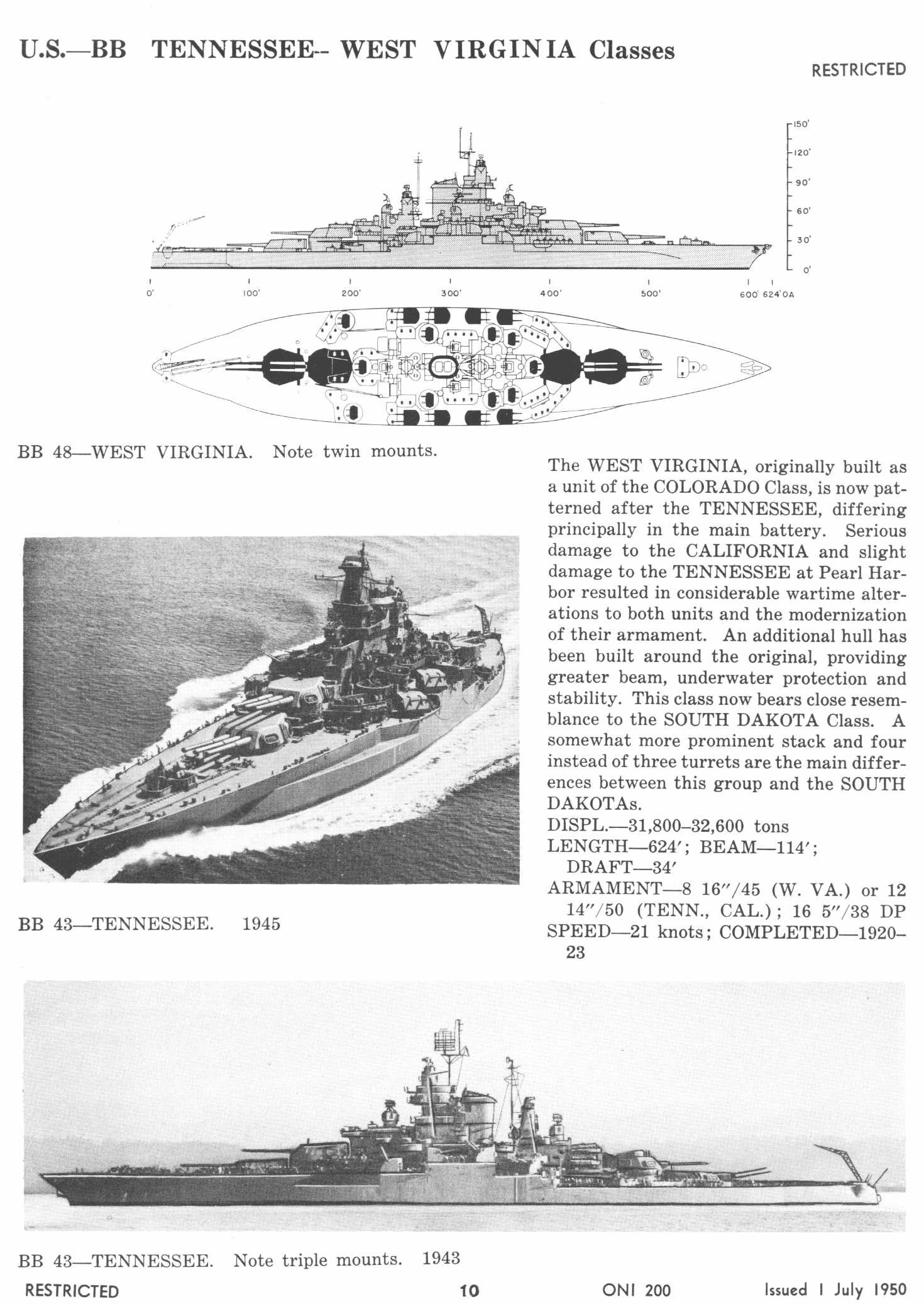 While Colorado and Maryland basically retained their gun configurations, West Virginia was completely renovated along the lines of California and Tennessee, before her return to the battleline in 1944, with 4 twin dual purpose 5" gun turrets along each side. All 3 ships were in the thick of battle.
