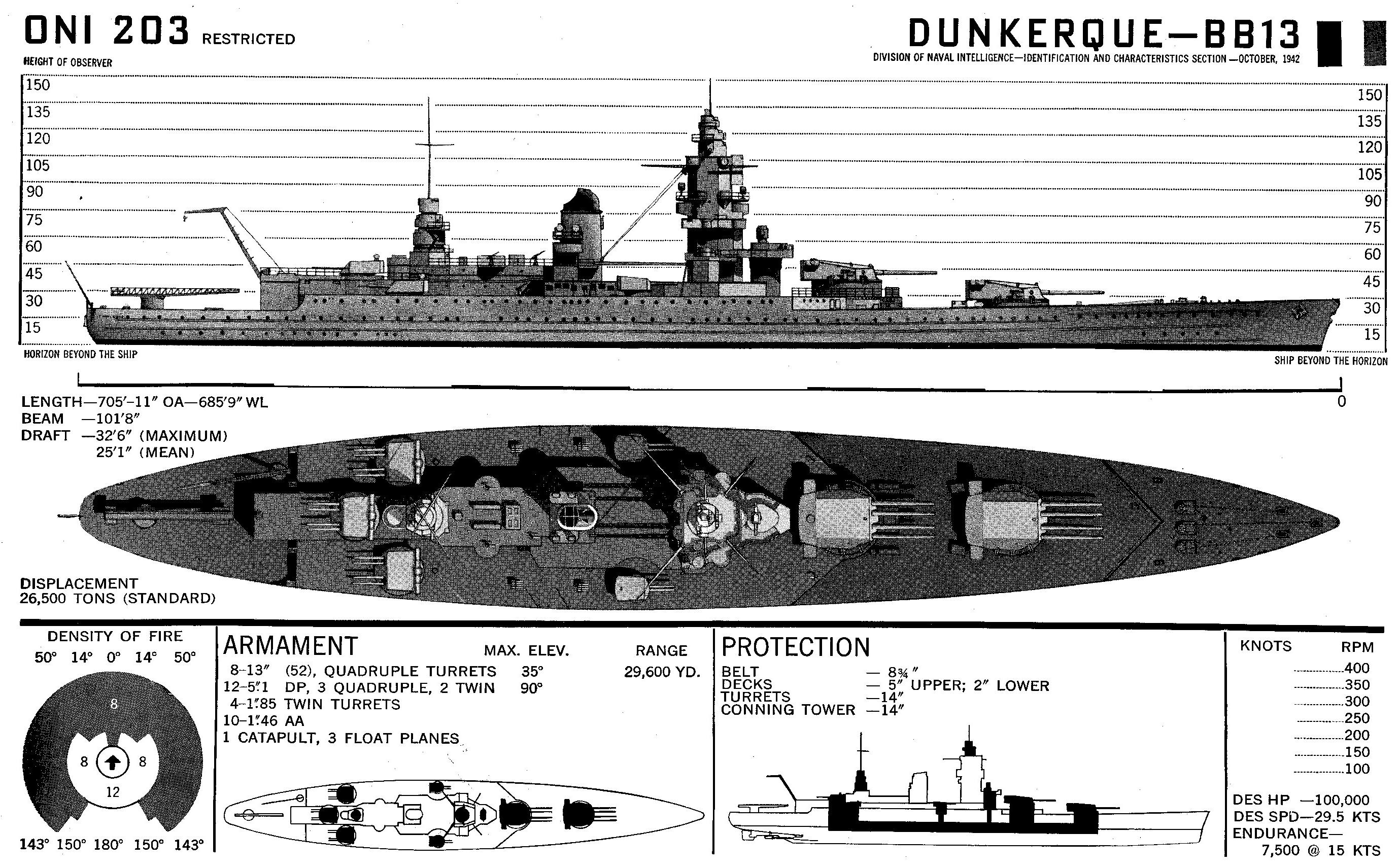 Beginning to feel threatened before World War 2 by such developments as the German Kriegsmarine's pocket battleships, French naval designers came up with the revolutionary concept of putting all a capital ship's main armament in quadruple gun turrets in the bow - in this case eight 13" guns in two quadruple turrets. Near sisterships, Dunkerque and Strasbourg were relatively well armored and at 29 knots, reasonably fast.