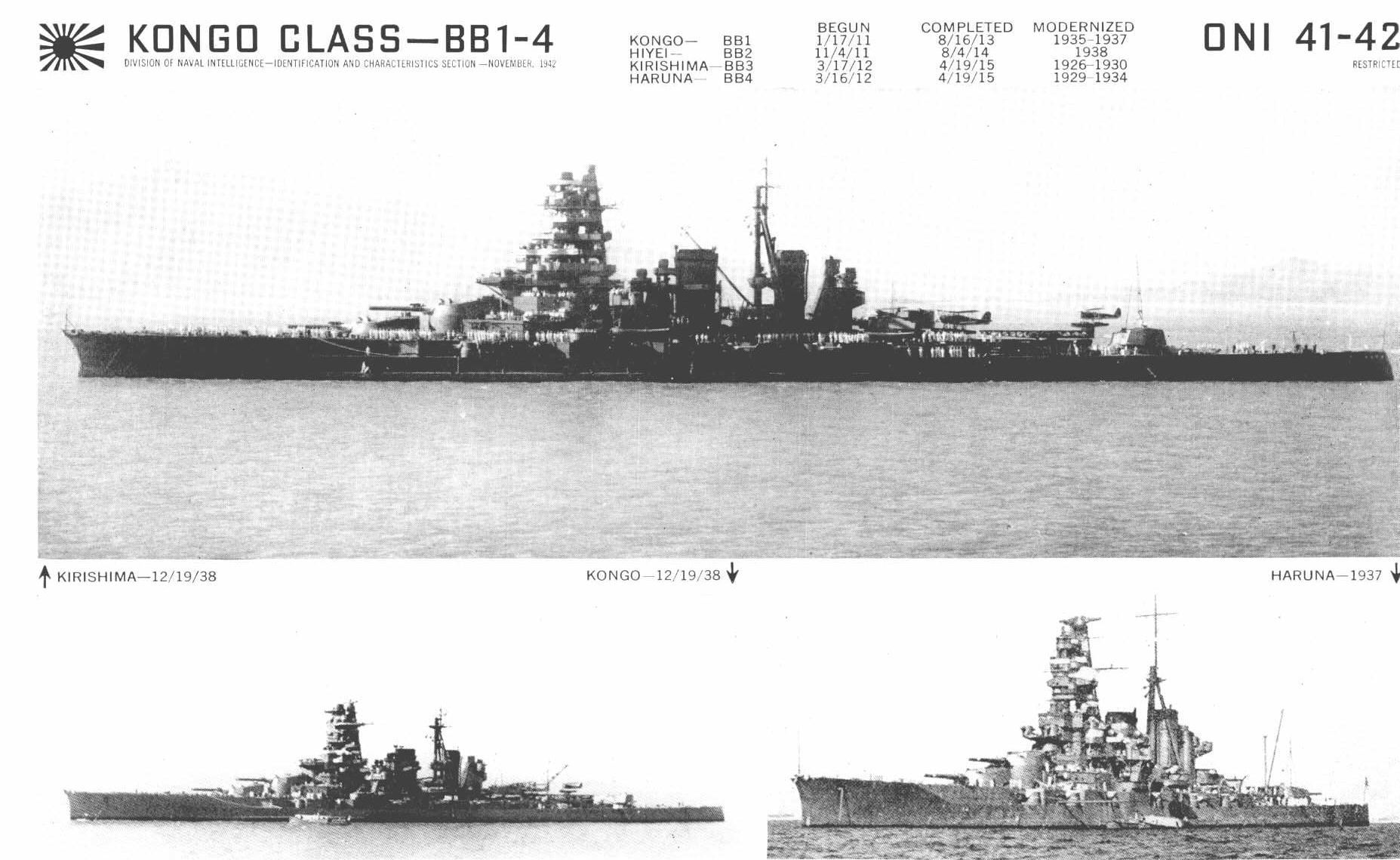 The Kongos were extensively reconstructed, within treaty limits, before World War II. Their 30-knot speed enabled them to escort the Japanese Navy's carrier striking force, the Kido Butai, along with the heavy cruiser/seaplane carriers Tone and Chikuma.