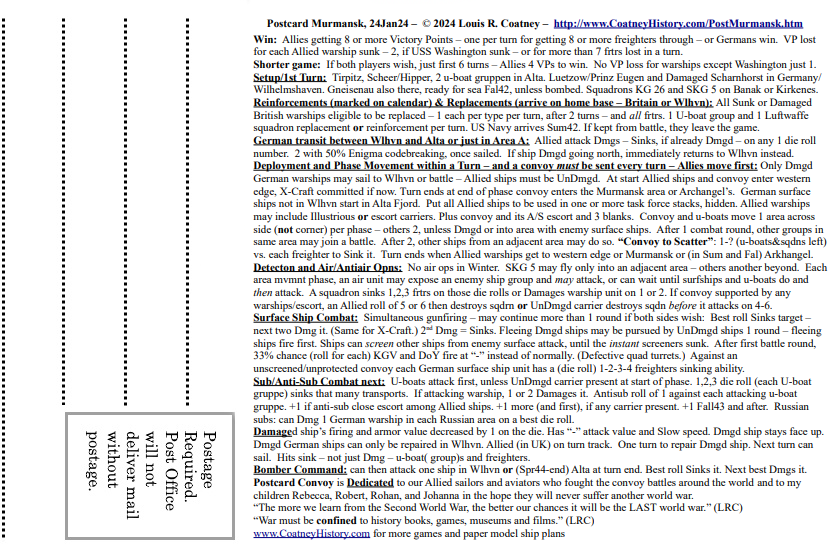 - ANYone is free to print off and distribu7te as many copies of my English language edition of Postcard Murmansk as (4"x6"/A6 and 5"x8"/A5) postcards as you like, as long as you keep my © 2024 Louis R. Coatney copyright statement, the Dedication, and my quotes about war and history on them.