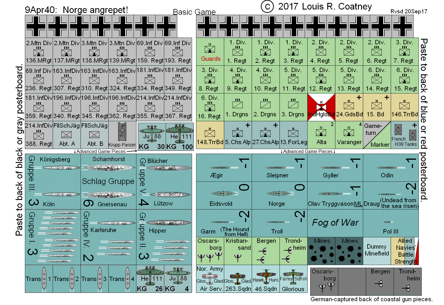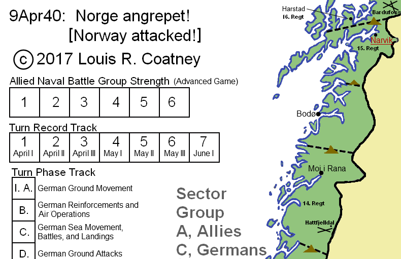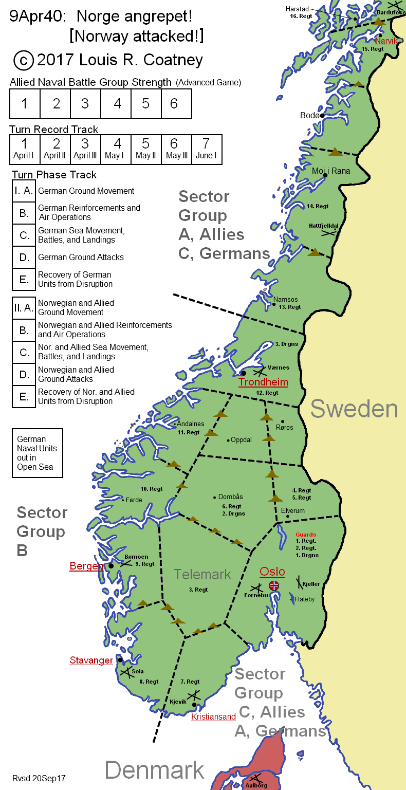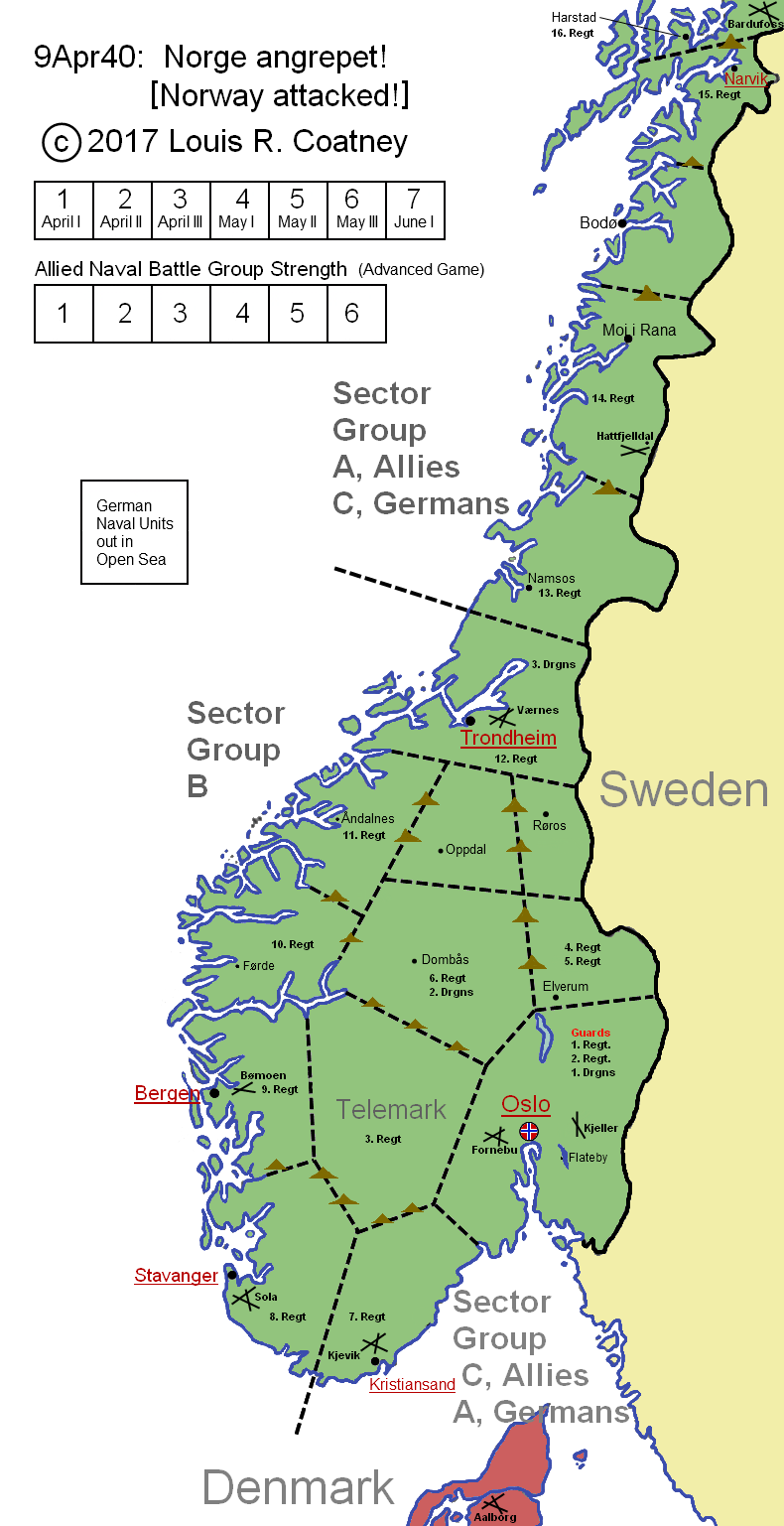 ... along with my personal thanks to Unni Berge and the historians of the excellent Norwegian Armed Forces Museum in Akershus Festning/Fortress and to Lørenskog and Skedsmo libraries'/bibliotekers librarians, as well to wargamers and historians Fred Forde, Tor Øyvind Mæhlum, Jack Greene (designer of the first Norway 1940 game, which is being revised and republished), and Eivind Vetlesen and Yngve Bækholt (the Norwegian designers of the excellent Kampen om Norge game, which has historical events/factors - and individual warship - cards to enliven play), for their advice, test-playing, and/or historical research assistance.