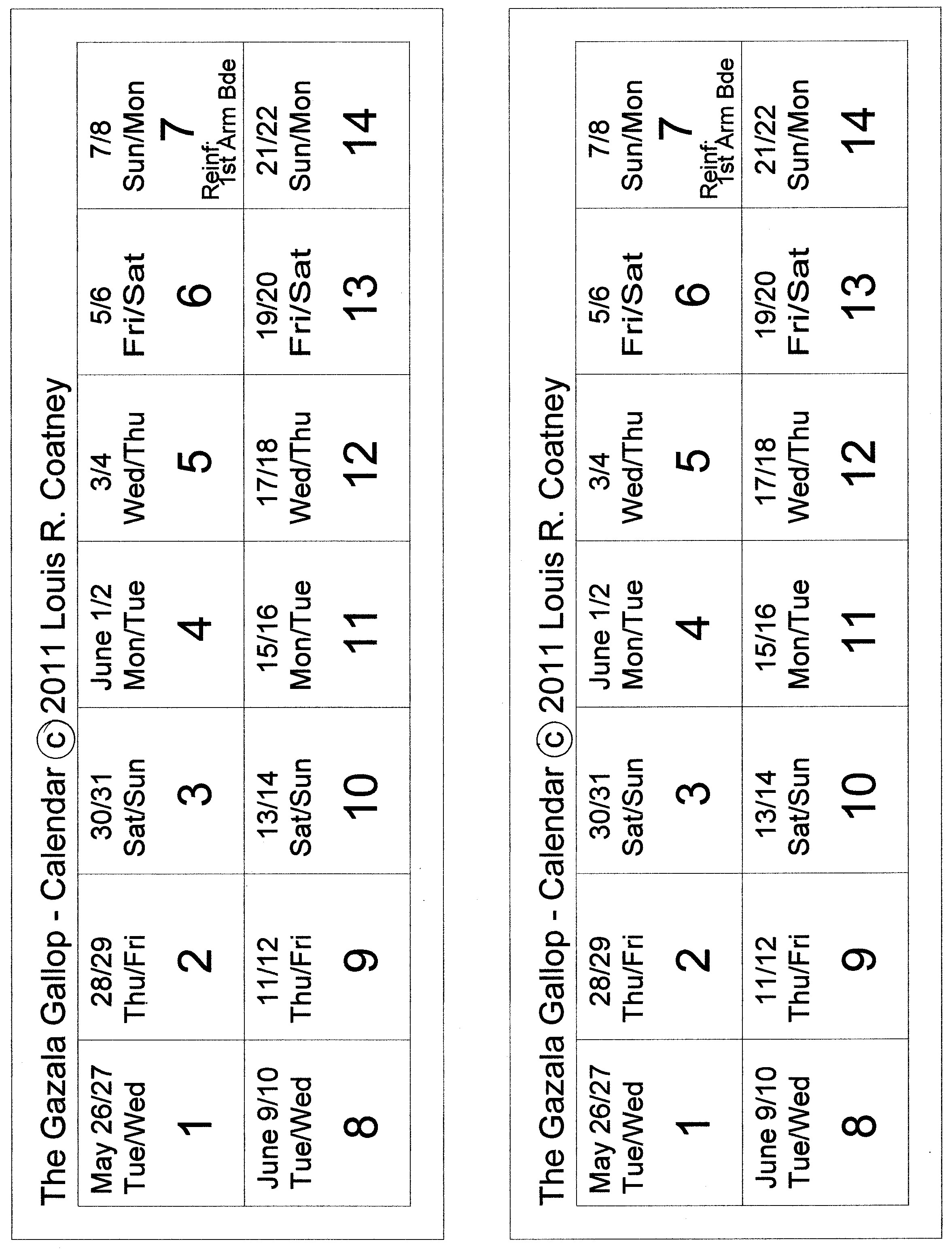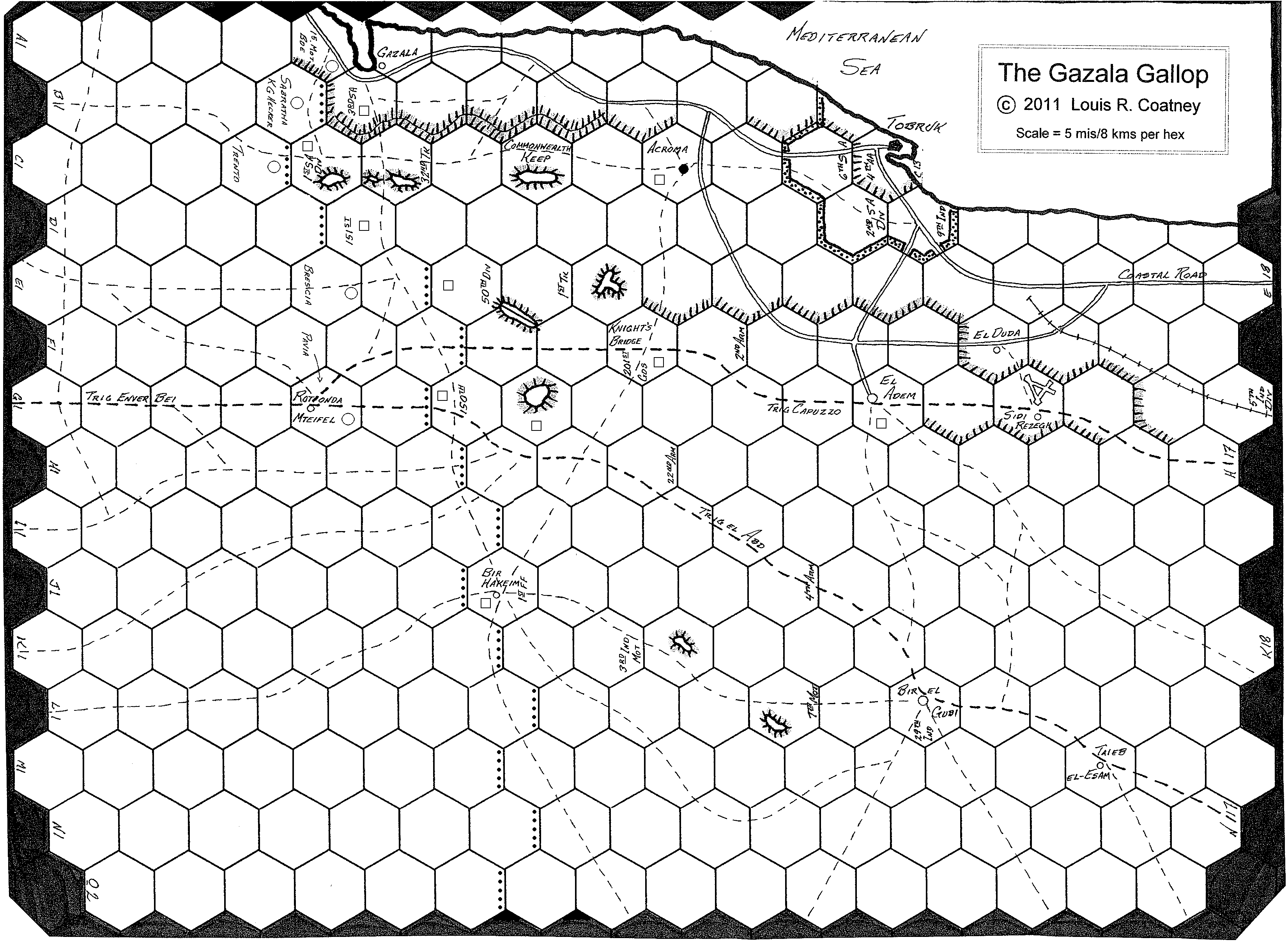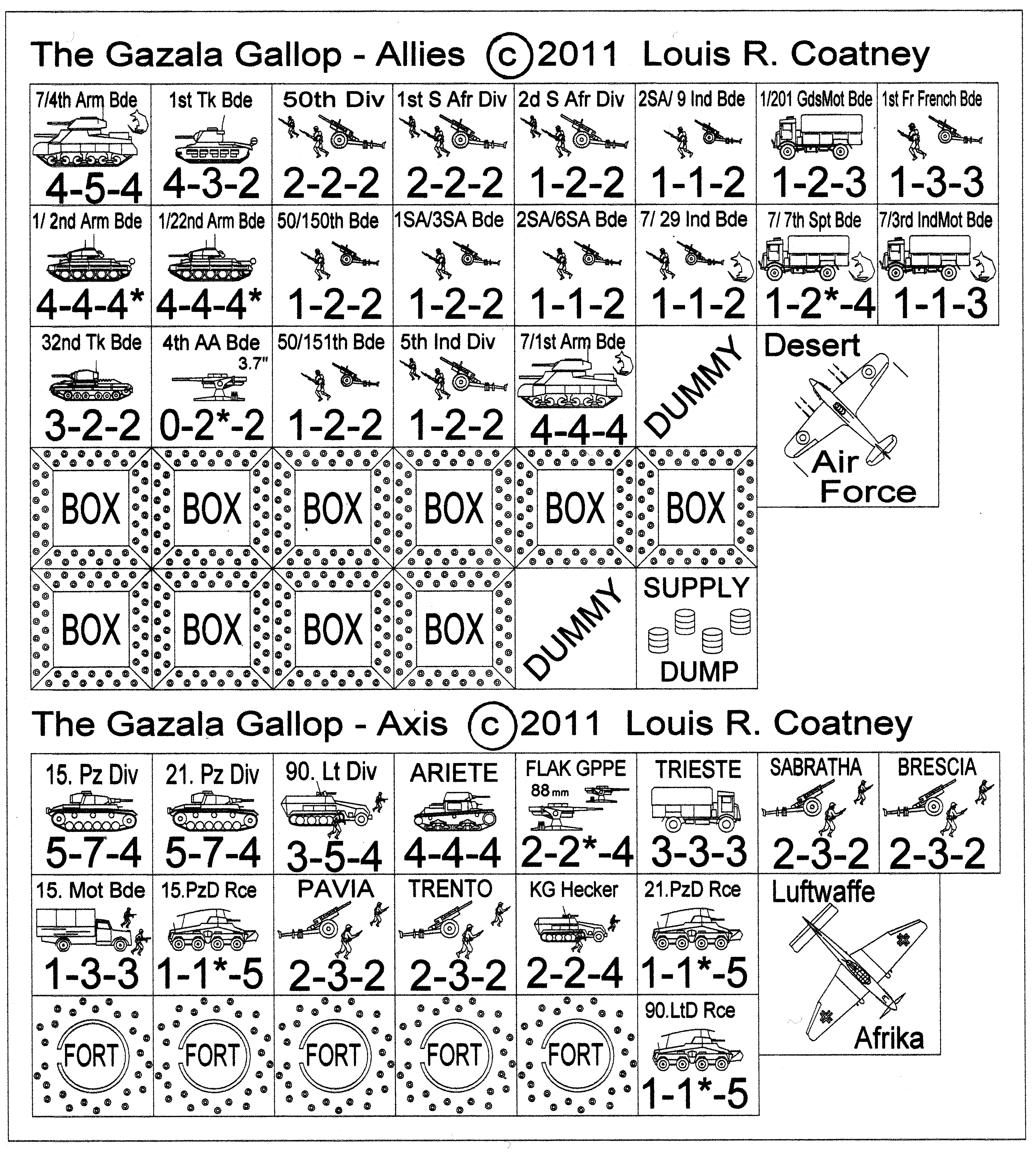 And now: Here are THE GAZALA GALLOP's components, to print off and assemble so that it may be played. Players-students will also need a single six-sided die (or chits numbered 1-6, to be drawn out of a hat) for the randomized combat results tables.