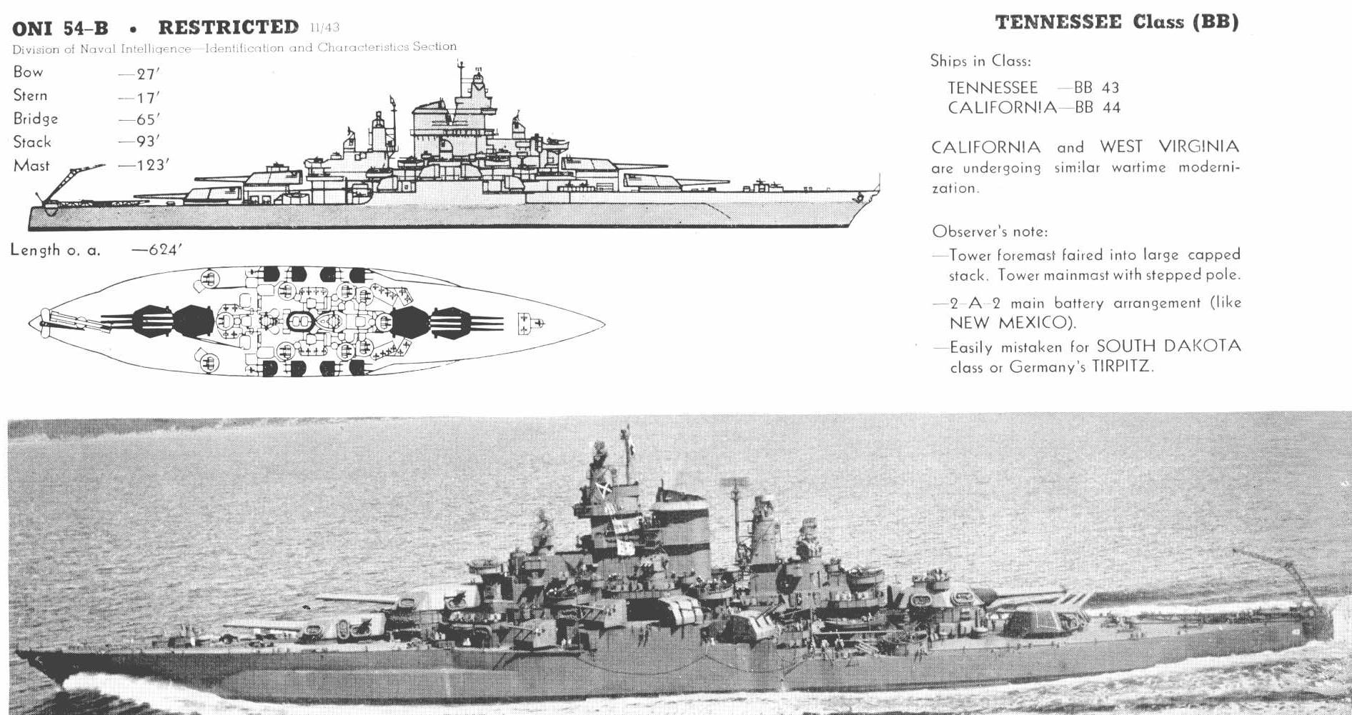 These were the last of the prewar 14" gunned battleships. After being damaged at Pearl Harbor, their superstructure was extensively simplified/redesigned and their secondary armament was revised with eight twin 5" dual purpose gun turrets and many 40mm and 20mm antiaircraft guns.