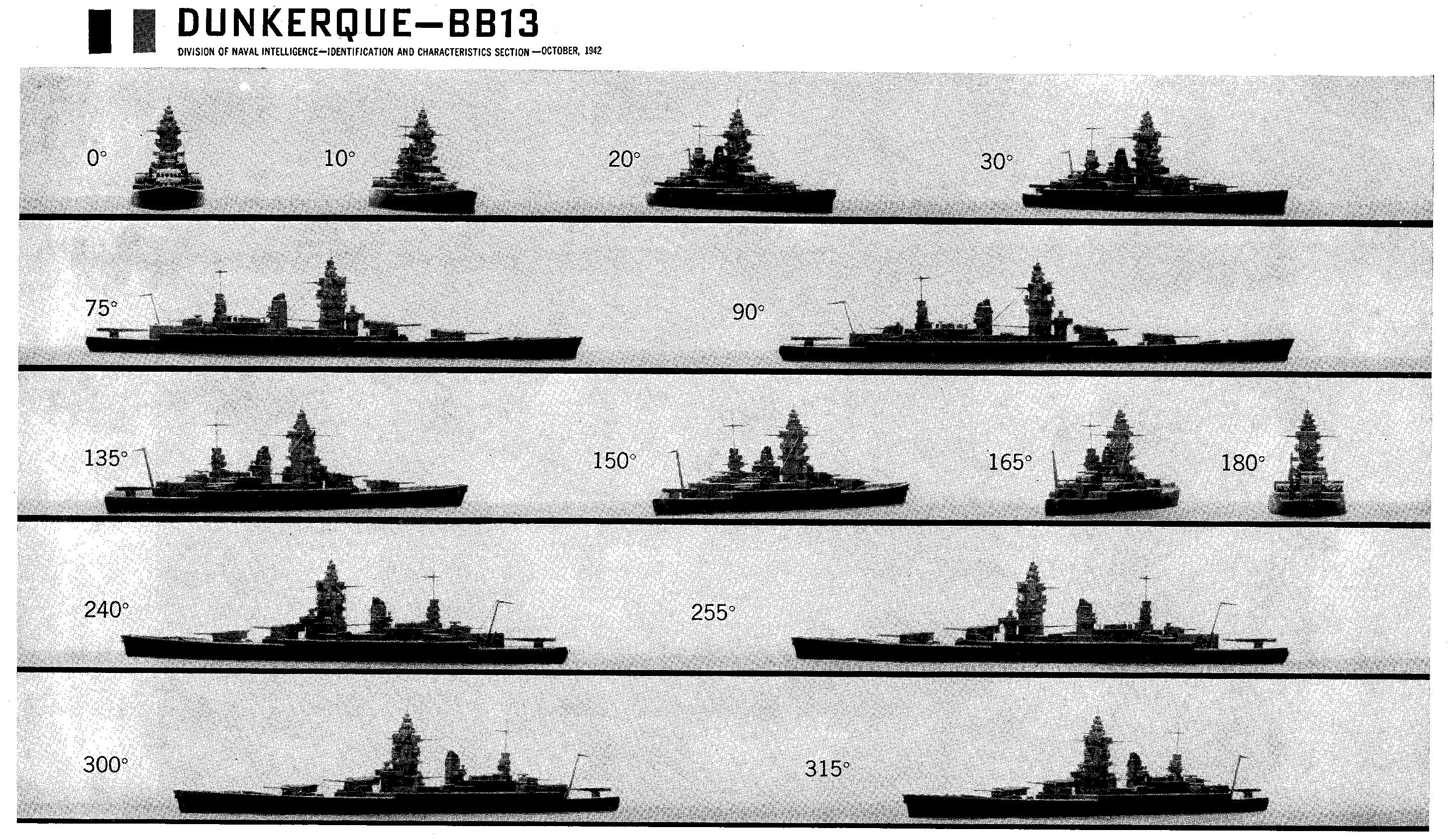 Beginning to feel threatened before World War 2 by such developments as the German Kriegsmarine's pocket battleships, French naval designers came up with the revolutionary concept of putting all a capital ship's main armament in quadruple gun turrets in the bow - in this case eight 13" guns in two quadruple turrets. Near sisterships, Dunkerque and Strasbourg were relatively well armored and at 29 knots, reasonably fast.