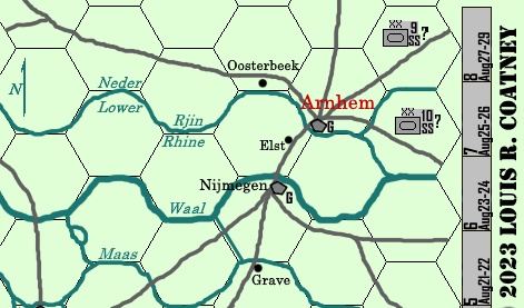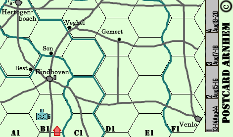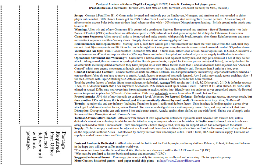 And now: Here are Postcard Arnhem's components, to print off and assemble so that it may be played. Players-students will also need a single six-sided die (or chits numbered 1-6, to be drawn out of a hat).