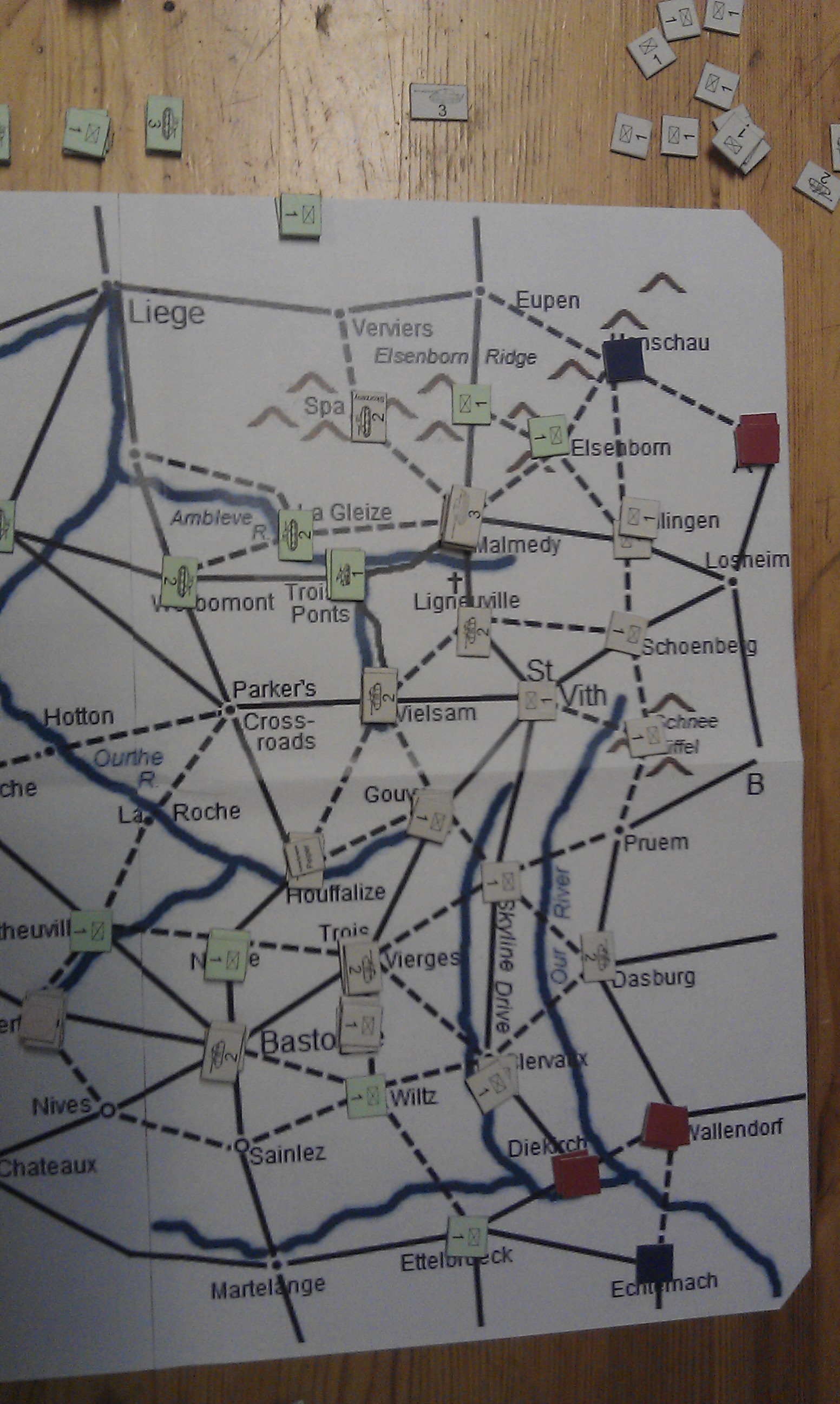 With both schwerpunkt leaders in the north, I thought I had Bastogne safely secured in the south, but he had taken my Spa fuel dump and had enough panzers and local infantry to take Bastogne too. He got a panzer off the board from Eupen for a victory point, and could have done the same for at least 1 more at Liege but didn't, not realizing I could then still attack down from the Liege-north route, which I did ... with 3rd Armored Division, no less ... retaking Liege and securing the north. He settled for a draw in the 5th turn.