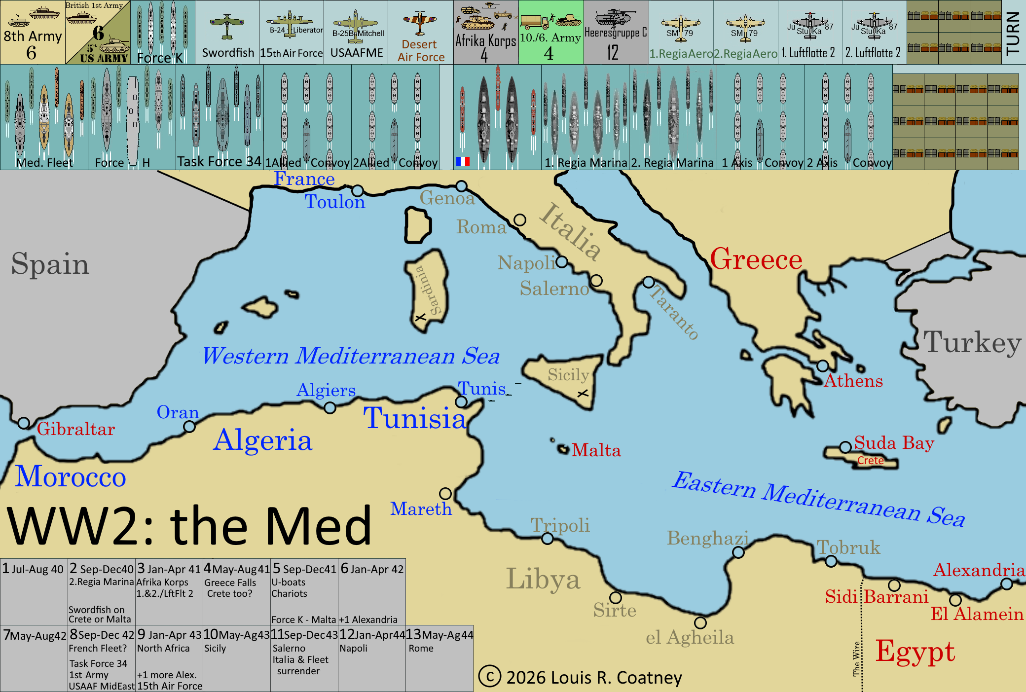 If you are a friend, and/or if you would like to share info and ideas about military and naval history and game designing and cardstock model shipbuilding, and/or you have any questions about WW2: the Med, feel free to e-mail me at ELCOAT@Hotmail.com